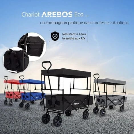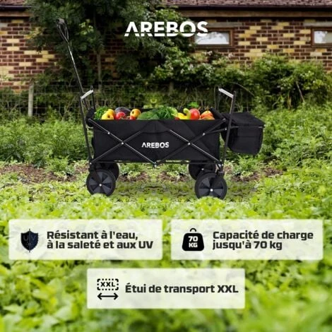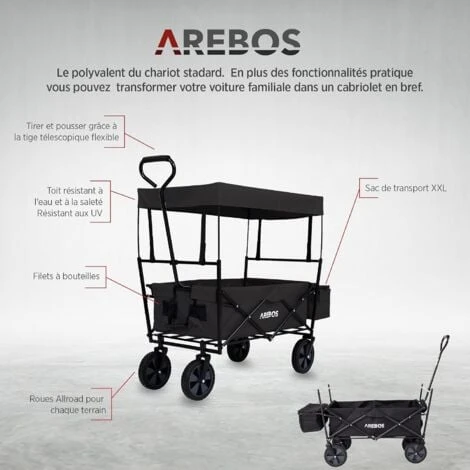 Le chariot utilitaire pliable est un véritable équipement polyvalent parmi les chariots utilitaires. Alors que la zone de charge, le sac de rangement XXL supplémentaire et plusieurs supports offrent beaucoup d’espace pour des voyages avec des enfants, pour les fêtes ou les autres activités de loisirs, le chariot peut également être plié au besoin.