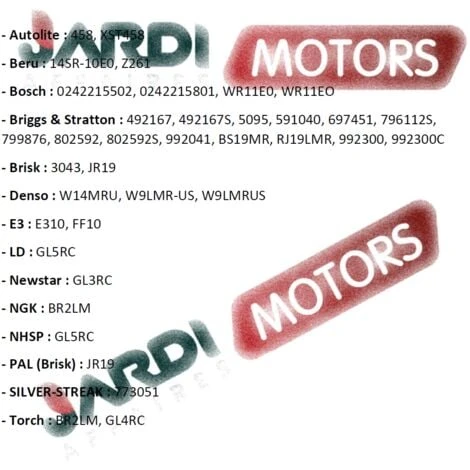 Bougie d’allumage Champion RJ19LM pour moteur BRIGGS & STRATTON (1ère monte à l’origine !), EAGER 1, MAGNUM, SACHS, TECUMSEH, KOHLER, BCS, … Dimensions de la bougie Champion RJ19LM : Taille de la clé 6 pans : 21mm, Filetage diamètre 14mm, Longueur de filetage 9.5mm Retrouvez notre tableau de correspondance (NGK BR2LM, Bosch, Denso, Torch, Briggs Stratton 992300…) pour vérifier avec votre référence de bougie et commander le bon modèle pour votre moteur. Jardiaffaires c’est plus de 60 références de bougies Champion en stock permanent.