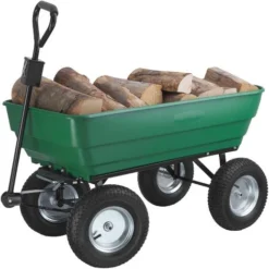 Chariot De Jardin à Main 75L Vert Avec Benne Basculante Remorque 4 Pneus Max 300 Kg Jardinage