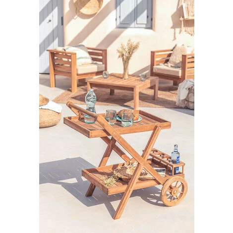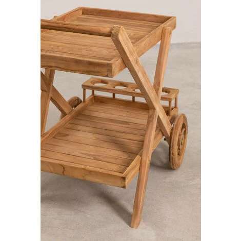 Aujourd’hui avoir un espace extérieur chez soi est un vrai privilège, il faut donc l’équiper de mobilier résistant si on veut en faire bon usage. Nous vous proposons notre chariot Pira, un chariot en bois de teck. Le chariot a 2 plateaux à lattes, 1 porte-bouteilles pour 4 conteneurs et 2 roues avant pour une mobilité facile. Un accessoire qui servira à la fois de table d’appoint pour la table de jardin et pour agrémenter votre terrasse ou balcon. Nous recommandons de le nettoyer avec du savon neutre et d’éviter l’utilisation de produits chimiques. Pour préserver la beauté du bois de teck, un entretien périodique et un traitement spécial avec des produits spécifiques sont nécessaires. Bien qu’il soit adapté à une utilisation en extérieur, nous vous conseillons de le protéger des phénomènes atmosphériques. Dimensions (Hauteur x Largeur x Profondeur): 81,5 cm x 50 cm x 84 cm IMPORTANT : Le service standard porte-à-porte ne comprend pas la livraison et la collecte des marchandises au domicile du client, qui sont à la charge de ce dernier. Il est possible que le livreur aide volontairement à la livraison de la marchandise (ceci est totalement volontaire pour le livreur et la société de transport et ne relève pas de la responsabilité de Sklum).L’assemblage n’est pas non plus inclus.