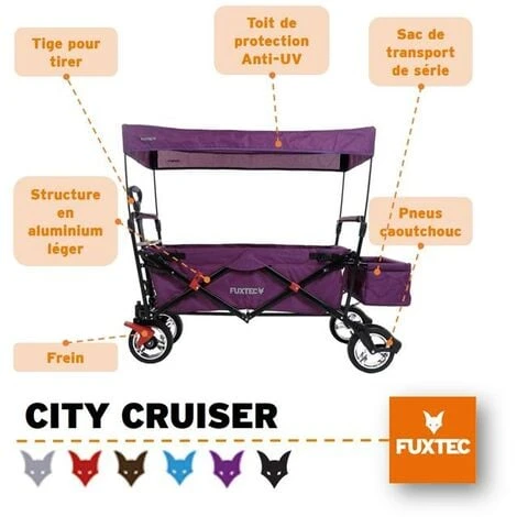 Le chariot de jardin City Cruiser (CT-500) est disponible en gris, marron, turquoise/bleu, pourpre/lilas et rouge. Un choix complet pour tous les goû ts et l’originalité signé e FUXTEC ! Il dispose de sé rie d’un toit anti-UV, d’une sacoche arriè re et d’un sac de transport supplé mentaire inclus.