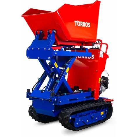 Dumper hydrostatique sur chenilles avec élévateur à ciseaux, élargissement des chenilles, benne basculante d’une capacité de 800 kg et moteur Honda de 9 ch.