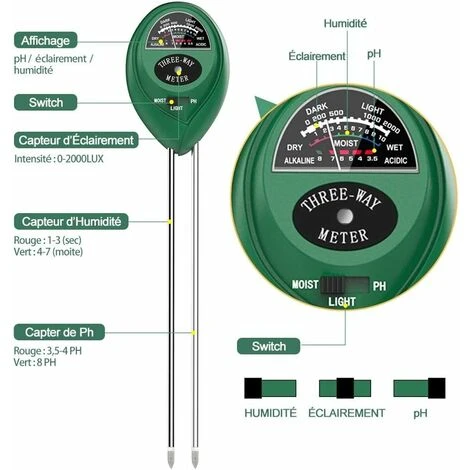 - 3 en 1 testeur : Le mètre 3 en 1 peut tester l’humidité du sol, le pH et le niveau d’ensoleillement des plantes sans piles. Insérez simplement la sonde dans le sol d’environ 2 à 4 pouces, puis placez le commutateur sur le testeur pour mesurer. Aidez-vous rapidement à vous concentrer sur le moment où vous devez arroser vos plantes, à contrôler le pH de votre sol et à voir si vous avez suffisamment de soleil.