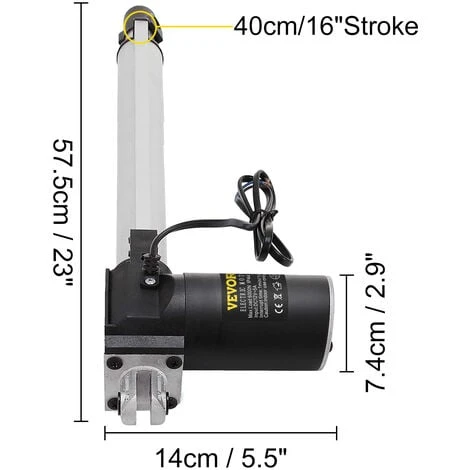- 【QUALITE SUPERIEURE】 – Type : actionneur electrique robuste ; longueur de course : 400 mm/16 po ; vitesse de deplacement : 5 mm/s ; puissance : CC(courant continu) 12 V ; interrupteur de fin de course : integre ; cet actionneur lineaire comprend un tube en alliage dealuminium de φ 24 mm deepaisseur et la construction metallique est pour la capacite de charge fonctionnelle et la durabilite. Il est robuste, bien scelle et a un niveau de protection IP44. Remarque : Nous recommandons deutiliser notre produit avec une alimentation electrique ayant une tension de sortie de 12 V DC et un courant de sortie de 8 ou 9 A.