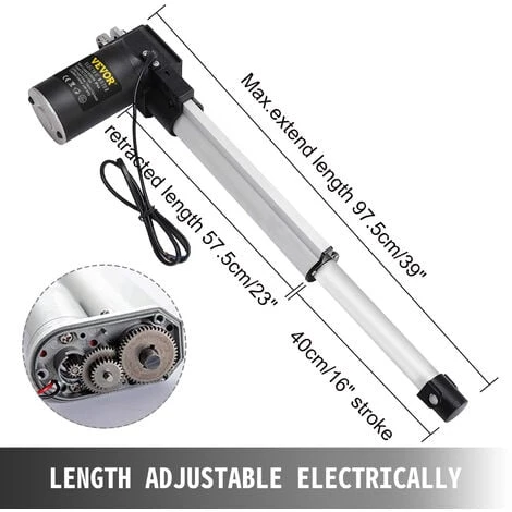 - 【FONCTION DE RETRACTATION ET D’EXTENSION】 – Cet actionneur lineaire electrique peut soulever ou abaisser puissamment la chaise longue, lequipement industriel, etc. Longueur retractee 575 mm/22,6 po et longueur allongee 975 mm/38,4 po. Arretez-vous a lendroit que vous voulez. Les engrenages en metal rendent le mouvement plus fluide.